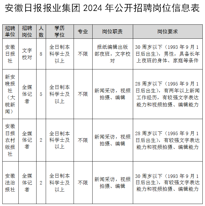 詳見《安徽日報報業(yè)集團2024年公開招聘崗位信息表》。