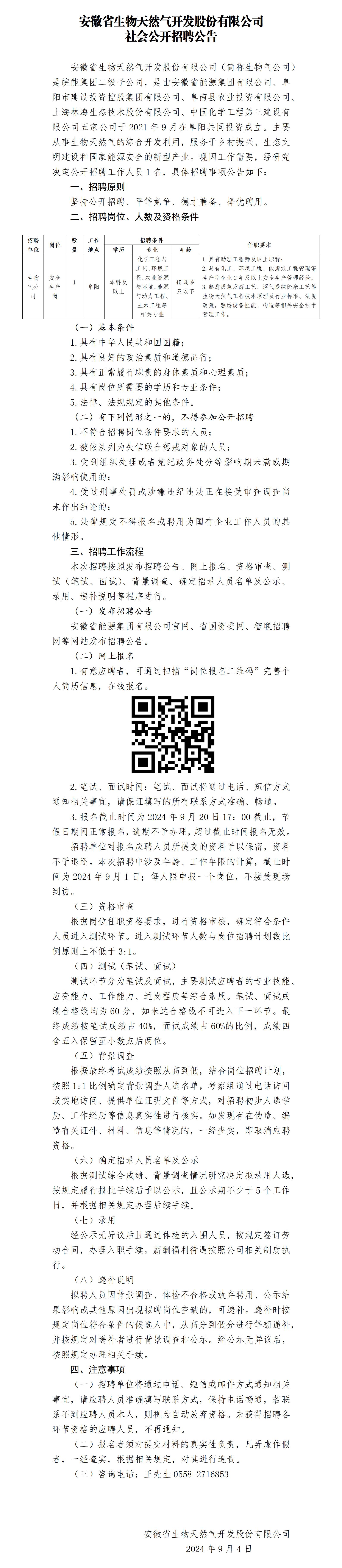 2024-09-11 15:14:57閱讀()安徽省能源集團(tuán)有限公司安徽省生物天然氣開發(fā)股份有限公司(簡稱生物氣公司)是皖能集團(tuán)二級子公司,是由安徽省能源集團(tuán)有限公司、阜陽市建設(shè)投資控股集團(tuán)有限公司、阜南縣農(nóng)業(yè)投資有限公司、上海林海生態(tài)技術(shù)股份有限公司、中國化學(xué)工程第三建設(shè)有限公司五家公司于2021年9月在阜陽共同投資成立。主要從事生物天然氣的綜合開發(fā)利用,服務(wù)于鄉(xiāng)村振興、生態(tài)文明建設(shè)和國家能源安全的新型產(chǎn)業(yè)?,F(xiàn)因工作需要,經(jīng)研究決定公開招聘工作人員1名,具體招聘事項公告如下: