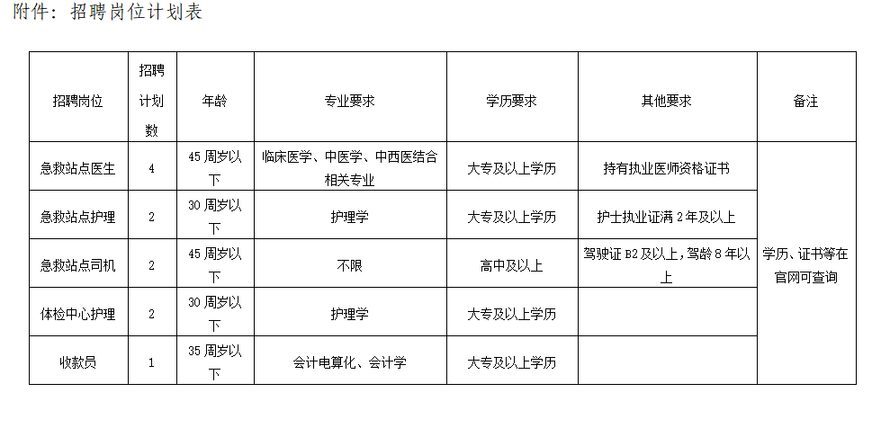 招聘急救站點醫(yī)生4人,急救站點護理2人,急救站點司機2人,體檢中心護理2人,收款員1人,合計11人,具體招聘崗位要求詳見附件。