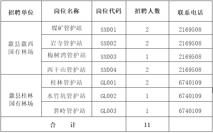 通過(guò)第三方勞務(wù)派遣方式招聘護(hù)林員共11名,其中:歙縣歙西國(guó)有林場(chǎng)7名、歙縣桂林國(guó)有林場(chǎng)4名。招聘崗位見(jiàn)附表。