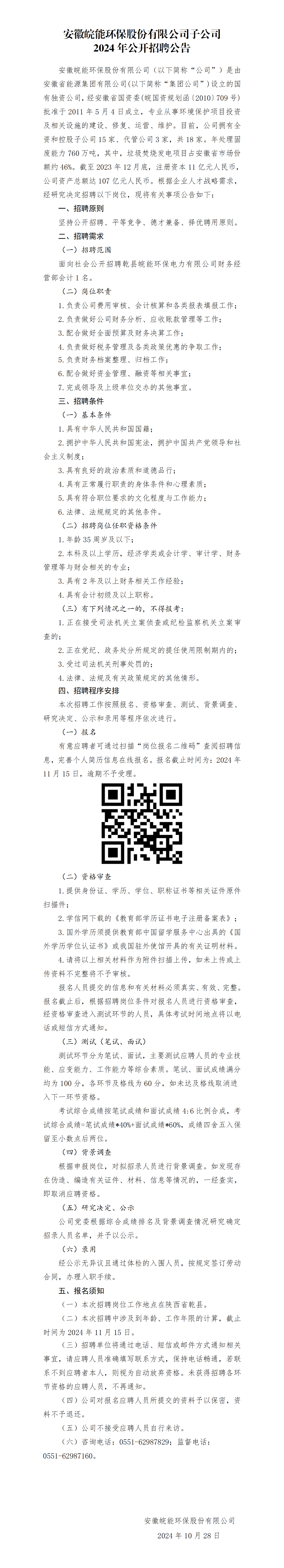 2024年安徽皖能環(huán)保股份有限公司子公司公開招聘公告