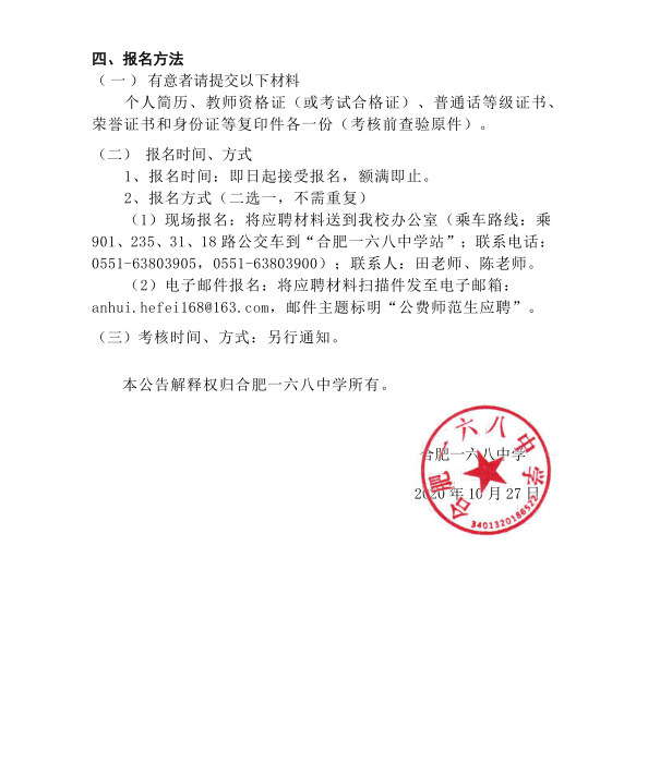 (2)電子郵件報名:將應聘材料掃描件發(fā)至電子郵箱:anhui.hefei168@163.com,郵件主題標明“公費師范生應聘”。