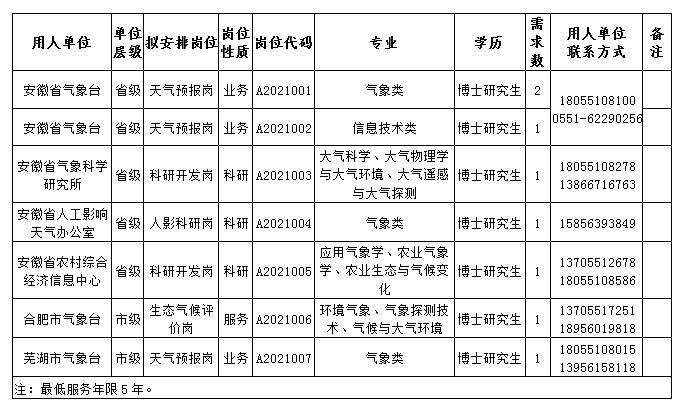 此次招聘崗位為博士崗位。具體單位、崗位、專(zhuān)業(yè)、學(xué)歷要求等詳見(jiàn)《安徽省氣象局2021年度事業(yè)單位博士研究生崗位需求表》。