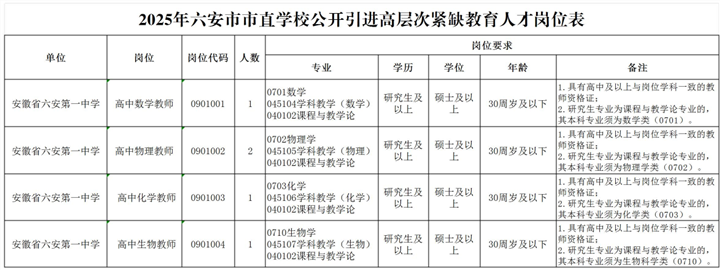 2025年安徽省六安第一中學(xué)引進(jìn)高層次緊缺教育人才共計5名。具體招聘崗位、條件如下: