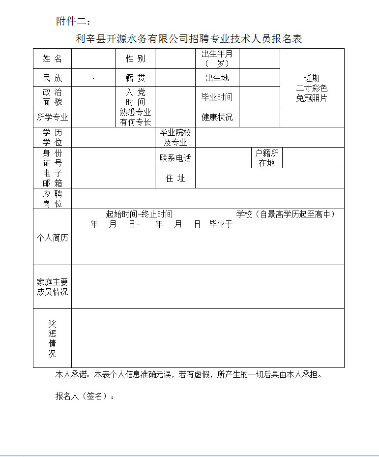 (1)《利辛縣開源水務有限公司招聘專業(yè)技術人員報名表》1份(見附件二);