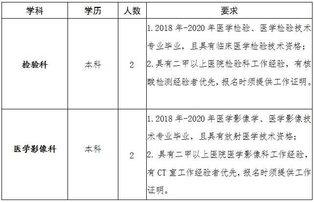 2021-02-01 18:15:41閱讀()太和縣人民醫(yī)院根據(jù)2021年檢驗(yàn)科和醫(yī)學(xué)影像科招聘計(jì)劃,結(jié)合疫情期間急需崗位需要,經(jīng)2021年1月30日院長(zhǎng)辦公會(huì)議研究,現(xiàn)對(duì)檢驗(yàn)科(核酸檢測(cè)室)和醫(yī)學(xué)影像科(CT室)急需人員面向社會(huì)公開(kāi)招聘。
