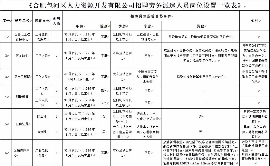 招聘崗位及要求見附件《合肥包河區(qū)人力資源開發(fā)有限公司招聘勞務(wù)派遣人員崗位設(shè)置一覽表》