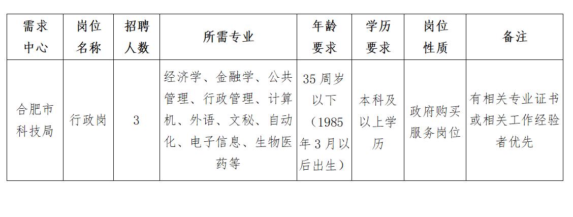 因工作需要,合肥市科學(xué)技術(shù)局現(xiàn)擬面向社會(huì)公開招聘政府購買服務(wù)崗位工作人員3名。現(xiàn)就有關(guān)事項(xiàng)公告如下: