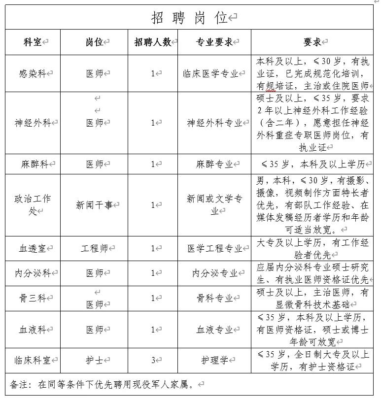 醫(yī)院根據(jù)工作需要,招聘第二批醫(yī)療、護(hù)理等部分崗位若干名。(具體見下表)