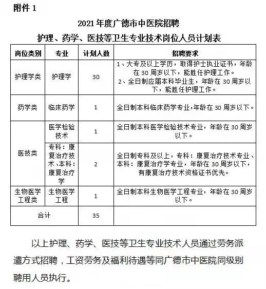 經(jīng)廣德市中醫(yī)院委托,按照公開、平等、競爭、擇優(yōu)的原則,面向社會(huì)公開招聘護(hù)理人員30名、藥學(xué)1名、醫(yī)技3名、生物醫(yī)學(xué)工程1名,由我公司派遣至廣德市中醫(yī)院工作,現(xiàn)將有關(guān)事項(xiàng)公告如下。