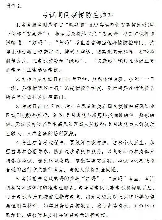 報(bào)考人員報(bào)名前,應(yīng)通過“皖事通”APP實(shí)名申領(lǐng)“安康碼”。報(bào)考人員報(bào)考前請認(rèn)真閱讀《考試期間疫情防控須知》(附件2)。報(bào)考人員提供的信息必須與本人實(shí)際情況、報(bào)考條件和所報(bào)考的崗位要求相一致。凡弄虛作假通過資格審查,其實(shí)際情況與報(bào)考條件規(guī)定不符的,一經(jīng)查實(shí),即取消考試、聘用等資格。