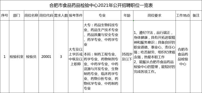 因工作需要,合肥市食品藥品檢驗(yàn)中心面向社會(huì)公開招聘3名檢驗(yàn)員,因報(bào)考人數(shù)少,結(jié)合報(bào)名情況,現(xiàn)對(duì)本次公開招聘工作做第二次調(diào)整,具體調(diào)整如下: