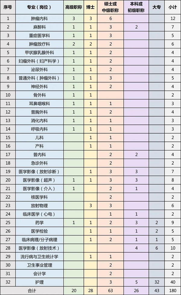 在中科院和安徽省暨合肥市的大力支持下,一所1500張床位的高水平、現(xiàn)代化三級甲等腫瘤專科醫(yī)院(高新院區(qū))正在建設中,根據(jù)醫(yī)院發(fā)展規(guī)劃,現(xiàn)面向全社會公開招聘各類專業(yè)技術人才,2020年人才招聘計劃如下: