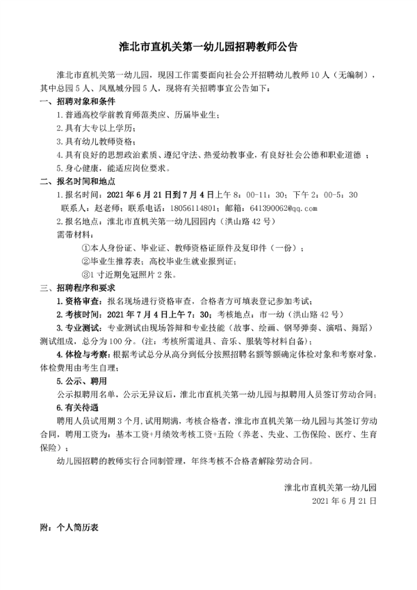 2021年淮北市直機(jī)關(guān)第一幼兒園招聘教師公告