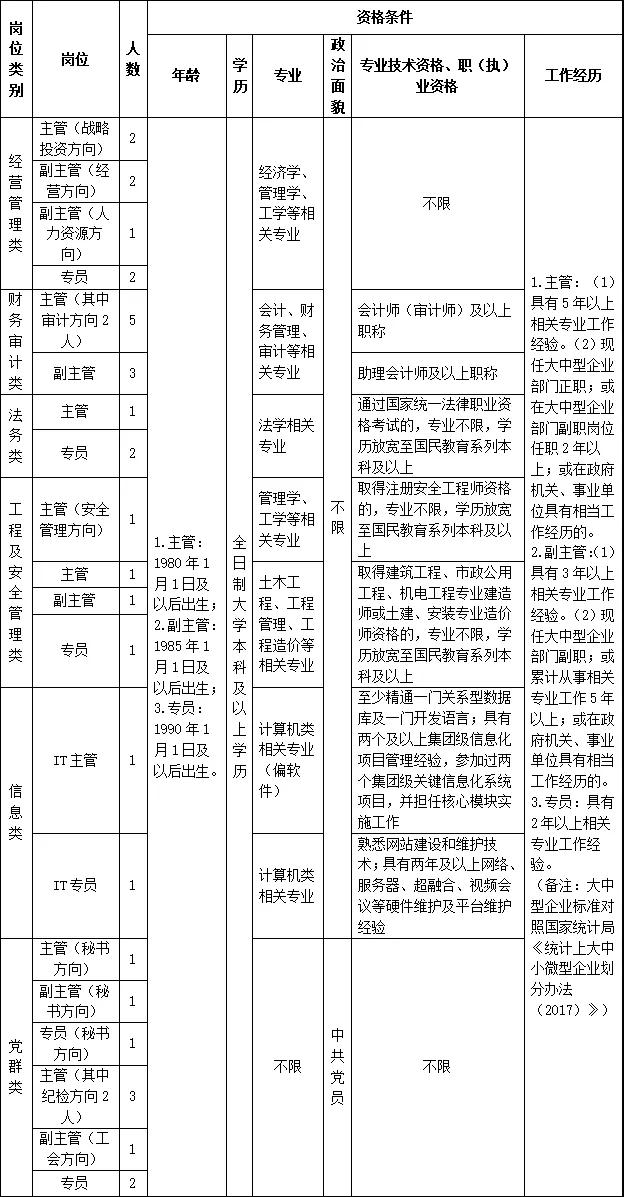 本次選聘競(jìng)聘淮海實(shí)業(yè)集團(tuán)機(jī)關(guān)33個(gè)崗位(見(jiàn)下表)。集團(tuán)機(jī)關(guān)在崗工作人員參加競(jìng)聘的,其資格條件按照《集團(tuán)公司管理和專業(yè)技術(shù)崗位管理辦法》(淮海發(fā)〔2020〕115號(hào))第十二條的第三、四、五款執(zhí)行;其他人員報(bào)名按以下資格條件執(zhí)行。