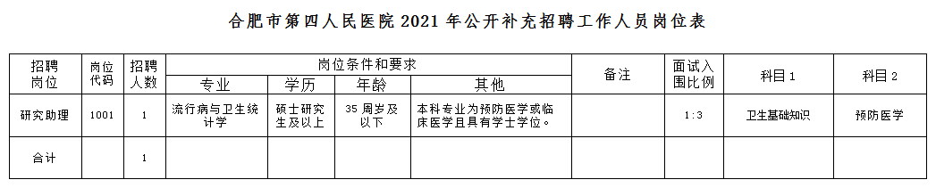 附:合肥市第四人民醫(yī)院2021年公開補充招聘工作人員崗位表