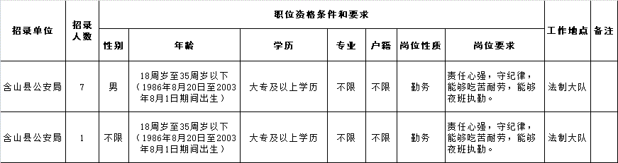 本次招聘警務輔助人員8名,具體職位見《馬鞍山市公安局含山片區(qū)招聘警務輔助人員職位表》(附件1)。