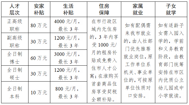 根據(jù)《中共淮北市委辦公室 淮北市人民政府辦公室關(guān)于印發(fā)〈淮北市事業(yè)單位引進(jìn)急需緊缺人才暫行辦法〉的通知》(辦〔2021〕27號(hào))等文件規(guī)定,對(duì)新引進(jìn)與用人單位簽訂5年以上合同全職在淮工作的急需緊缺人才,除正常享受所在事業(yè)單位工作人員工資和各項(xiàng)福利外,還享受安家補(bǔ)貼、生活補(bǔ)貼、住房保障、家屬就業(yè)、子女就學(xué)等方面的優(yōu)惠待遇。