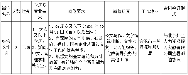 因工作需要,合肥市自然資源和規(guī)劃局招聘政府購買崗位服務(wù)人員3名。具體如下 :