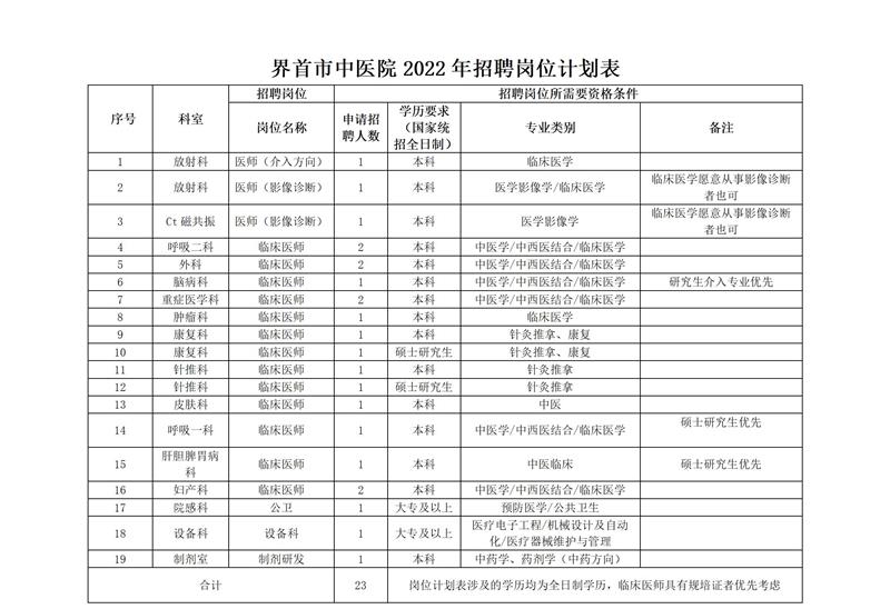 本次計劃公開招聘醫(yī)療衛(wèi)生專業(yè)技術(shù)人員23名,具體招聘崗位、人數(shù)、專業(yè)、報考條件等詳見《界首市中醫(yī)院2022年招聘崗位計劃表》(附件)。