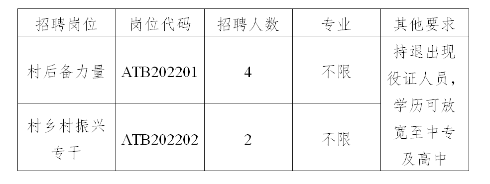 因工作需要,經(jīng)研究,現(xiàn)面向社會公開招聘4名村級后備力量和2名鄉(xiāng)村振興專干,現(xiàn)將有關(guān)事項公告如下: