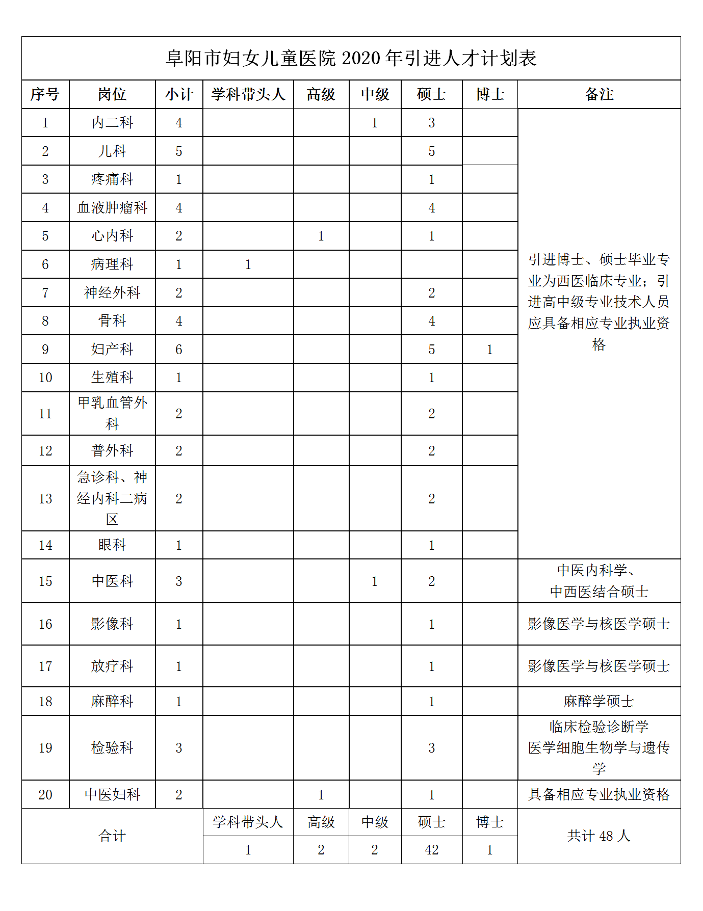 附件:阜陽市婦女兒童醫(yī)院2020年引進人才計劃表