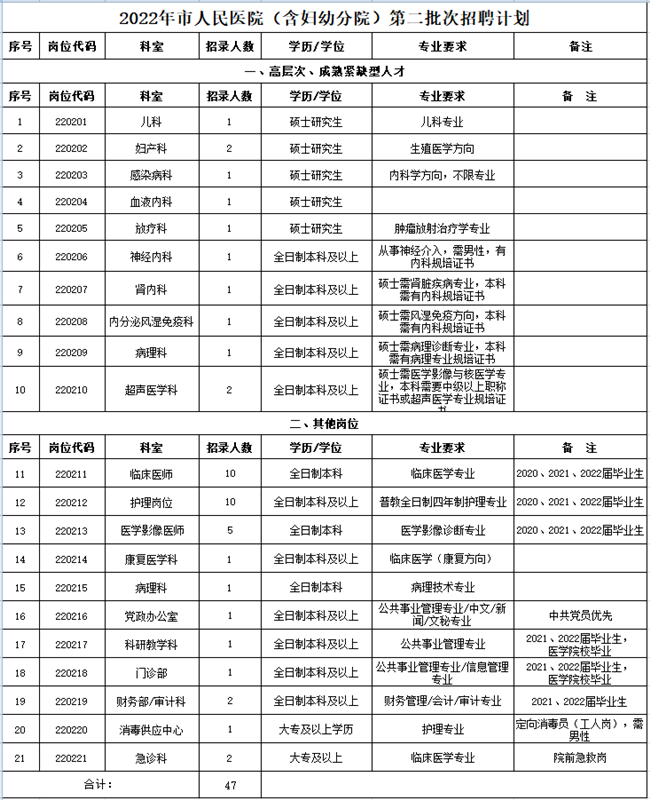 2022-05-26 20:22:23閱讀()宣城市人民醫(yī)院為滿足市人民醫(yī)院及市婦幼保健院發(fā)展需要,加強(qiáng)人才隊(duì)伍建設(shè),按照公開、平等、競爭、擇優(yōu)的原則,面向社會公開招聘工作人員,現(xiàn)將有關(guān)事項(xiàng)通知如下: