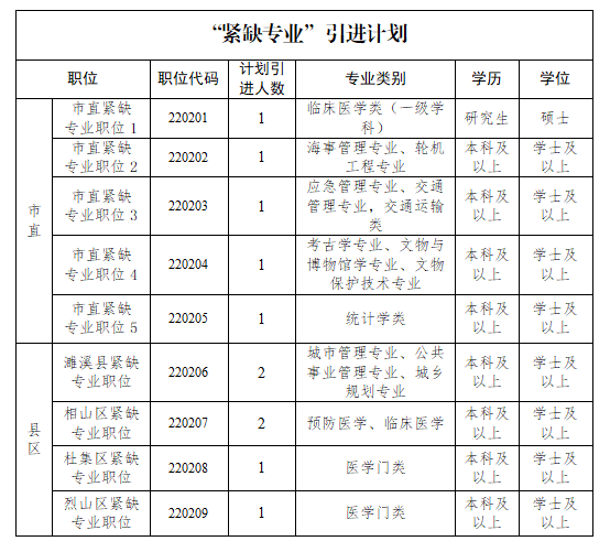 采取“大學(xué)科”+“緊缺專業(yè)”形式,市縣(區(qū))“大學(xué)科”計(jì)劃引進(jìn)博士人數(shù)不限、文史類23名、理工類37名,“緊缺專業(yè)”計(jì)劃引進(jìn)11名(崗位如下):