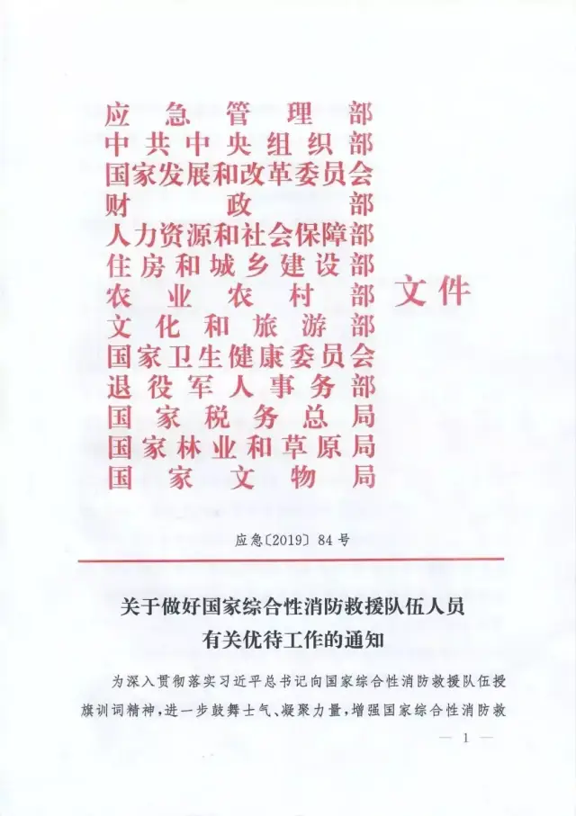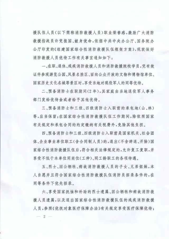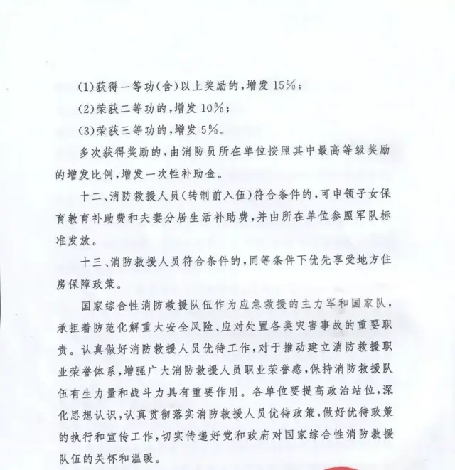 國家發(fā)展改革委員會(huì)、教育部、財(cái)政部、人力資源社會(huì)保障部、交通運(yùn)輸部、退役軍人事務(wù)部等部委與應(yīng)急管理部聯(lián)合出臺(tái)的《關(guān)于做好國家綜合性消防救援隊(duì)伍人員有關(guān)優(yōu)待工作的通知》(應(yīng)急〔2019〕84號(hào))、《關(guān)于保障國家綜合性消防救援隊(duì)伍人員交通出行優(yōu)待權(quán)益有關(guān)事項(xiàng)的通知》(交運(yùn)規(guī)〔2019〕4號(hào))等文件,明確國家綜合性消防救援隊(duì)伍人員在傷亡撫恤、退出安置、就業(yè)創(chuàng)業(yè)、家庭優(yōu)待、子女入學(xué)、住房醫(yī)療、交通出行、參觀游覽等方面享受專門優(yōu)待政策。