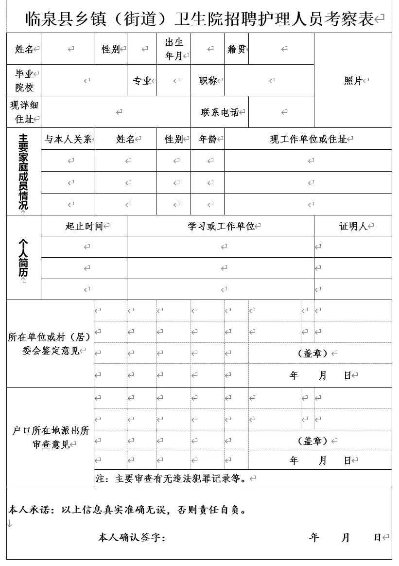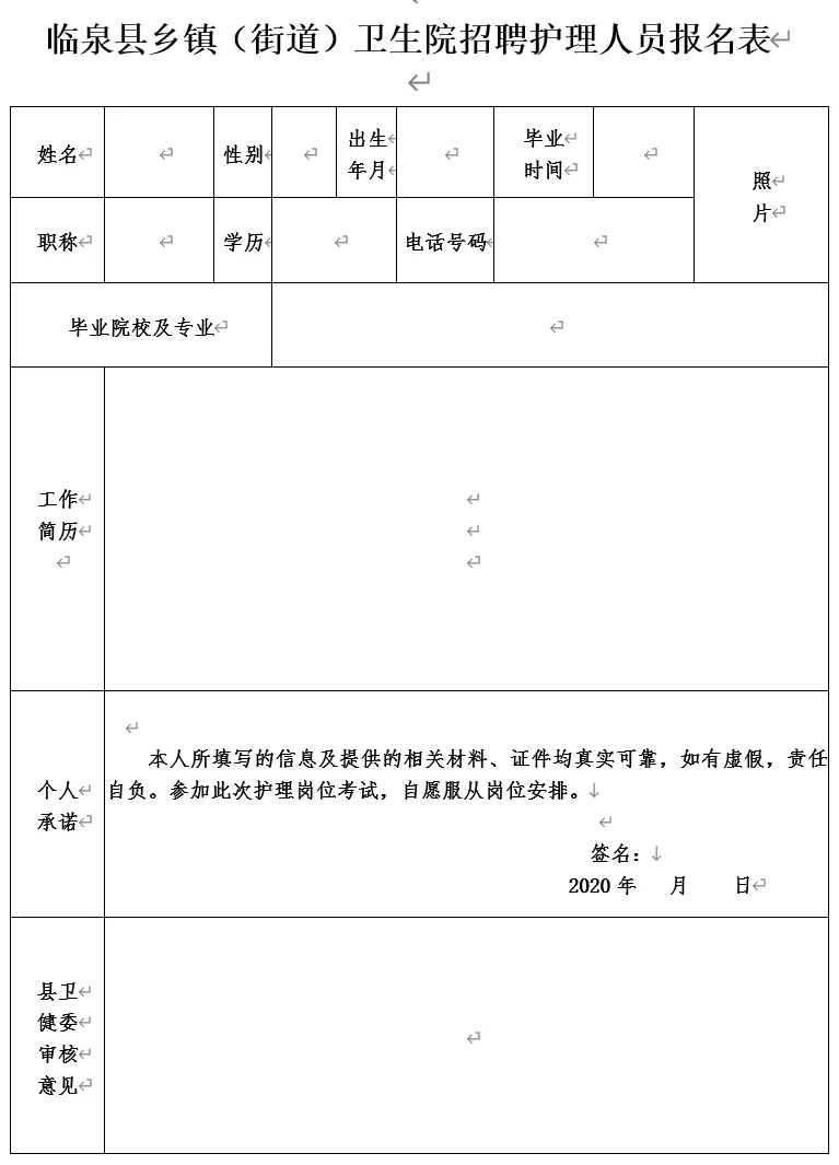 1、臨泉縣鄉(xiāng)鎮(zhèn)(街道)衛(wèi)生院招聘護(hù)理人員報(bào)名表