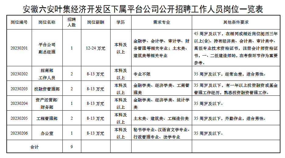 根據(jù)工作需要,安徽六安葉集經(jīng)濟開發(fā)區(qū)下屬平臺公司(國有企業(yè))現(xiàn)擬面向社會公開招聘9名工作人員,現(xiàn)就有關事項公告如下: