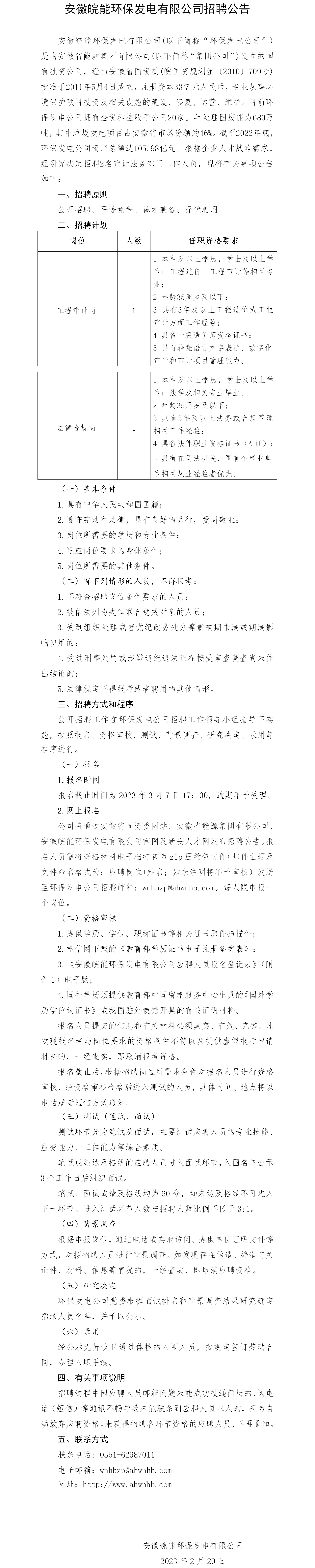 2023-02-23 16:23:50閱讀()安徽省能源集團有限公司安徽皖能環(huán)保發(fā)電有限公司(以下簡稱“環(huán)保發(fā)電公司”)是由安徽省能源集團有限公司(以下簡稱“集團公司”)設(shè)立的國有獨資公司,經(jīng)由安徽省國資委(皖國資規(guī)劃函〔2010〕709號)批準(zhǔn)于2011年5月4日成立,注冊資本33億元人民幣,專業(yè)從事環(huán)境保護項目投資及相關(guān)設(shè)施的建設(shè)、修復(fù)、運營、維護。目前環(huán)保發(fā)電公司擁有全資和控股子公司20家。年處理固廢能力680萬噸,其中垃圾發(fā)電項目占安徽省市場份額約46%。截至2022年底,環(huán)保發(fā)電公司資產(chǎn)總額達(dá)105.98億元。根據(jù)企業(yè)人才戰(zhàn)略需求,經(jīng)研究決定招聘2名審計法務(wù)部門工作人員,現(xiàn)將有關(guān)事項公告如下:
