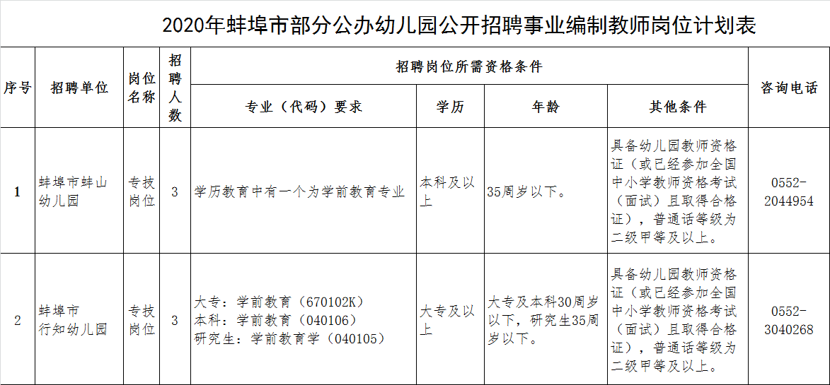 2020年度蚌埠市部分公辦幼兒園新任教師(編制內(nèi))公開招聘崗位計劃共6名(具體學科崗位情況見附件)。