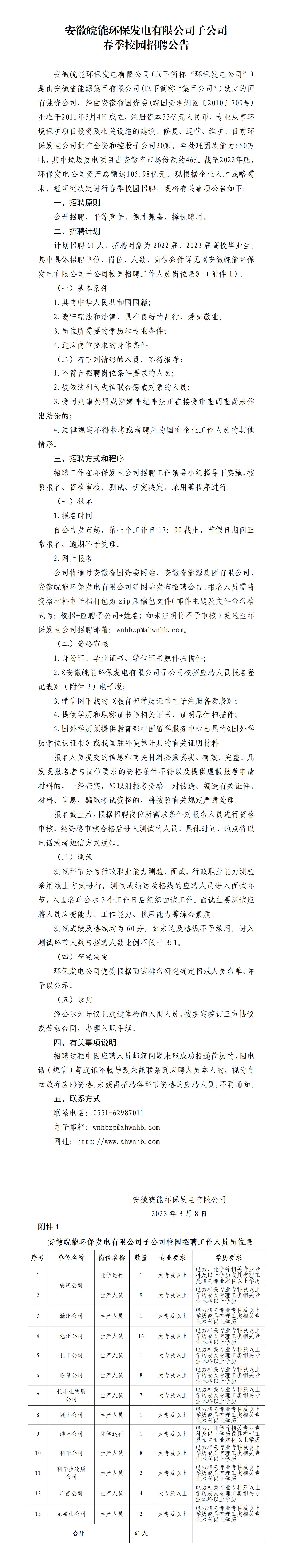 2023-03-09 15:36:40閱讀()安徽省能源集團有限公司安徽皖能環(huán)保發(fā)電有限公司(以下簡稱“環(huán)保發(fā)電公司”)是由安徽省能源集團有限公司(以下簡稱“集團公司”)設(shè)立的國有獨資公司,經(jīng)由安徽省國資委(皖國資規(guī)劃函〔2010〕709號)批準于2011年5月4日成立,注冊資本33億元人民幣,專業(yè)從事環(huán)境保護項目投資及相關(guān)設(shè)施的建設(shè)、修復(fù)、運營、維護。目前環(huán)保發(fā)電公司擁有全資和控股子公司20家,年處理固廢能力680萬噸,其中垃圾發(fā)電項目占安徽省市場份額約46%。截至2022年底,環(huán)保發(fā)電公司資產(chǎn)總額達105.98億元?,F(xiàn)根據(jù)企業(yè)人才戰(zhàn)略需求,經(jīng)研究決定進行春季校園招聘,現(xiàn)將有關(guān)事項公告如下: