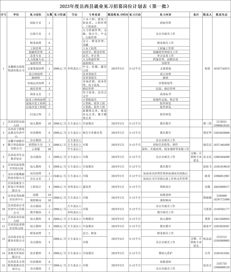 具體崗位情況、招聘條件、見習(xí)待遇及見習(xí)內(nèi)容等見附件《2023年度岳西縣就業(yè)見習(xí)招募崗位計(jì)劃表(第一批)》。