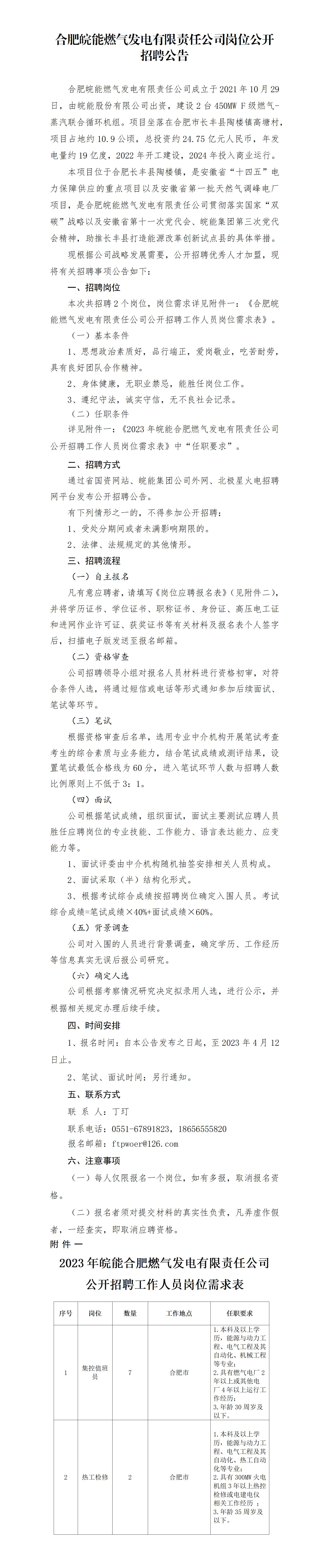 本次共招聘2個崗位,崗位需求詳見附件一:《合肥皖能燃氣發(fā)電有限責任公司公開招聘工作人員崗位需求表》。