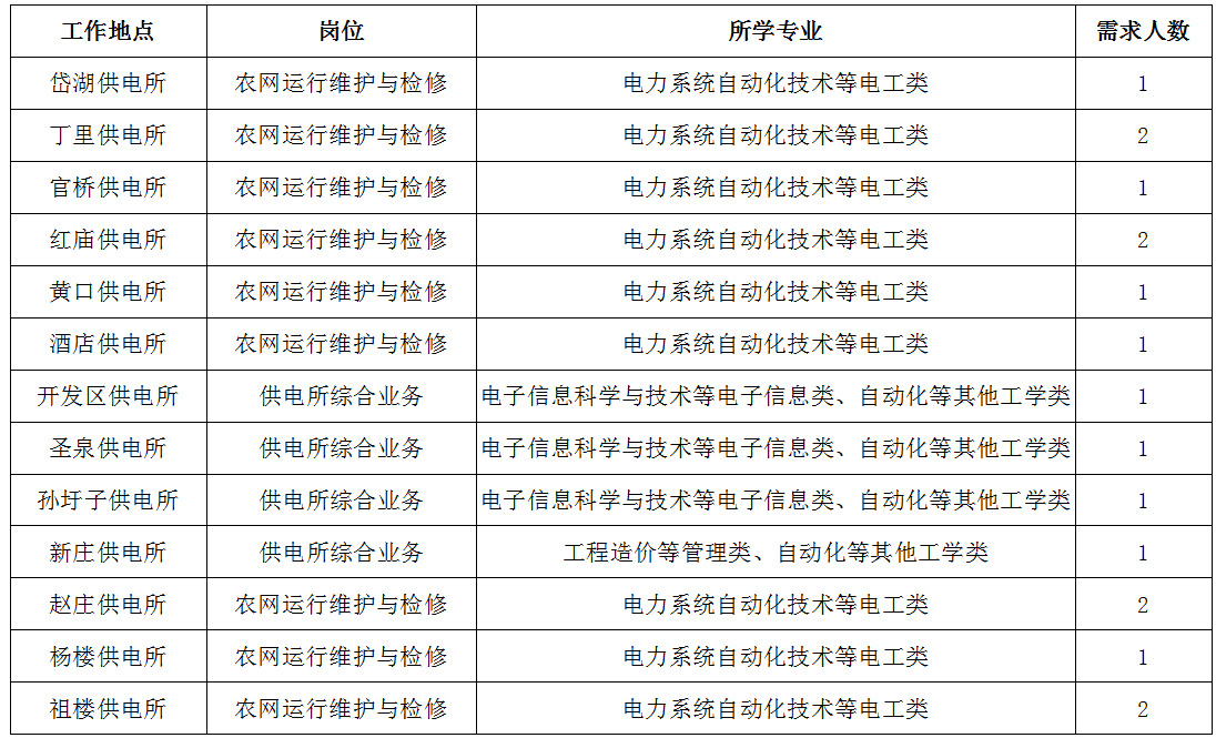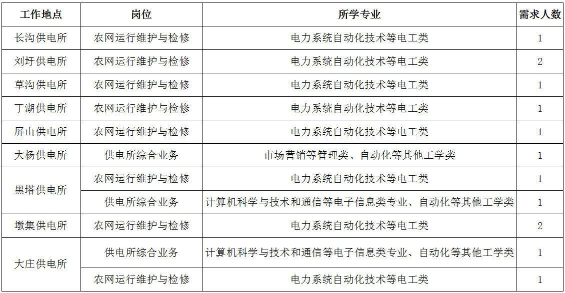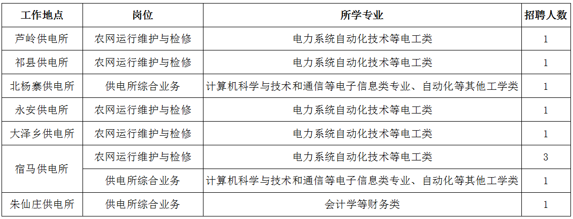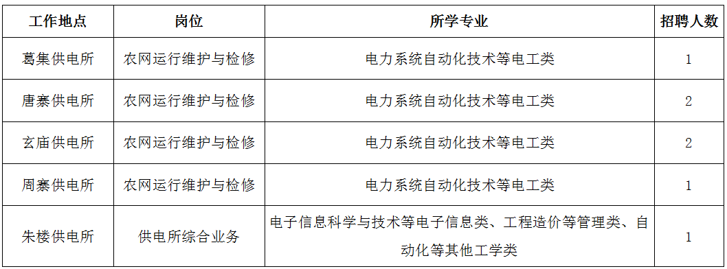 公司計(jì)劃招聘79人,派駐至鄉(xiāng)鎮(zhèn)供電所從事農(nóng)電崗位工作,其中農(nóng)網(wǎng)運(yùn)行維護(hù)與檢修崗位需登桿作業(yè),限招男生。