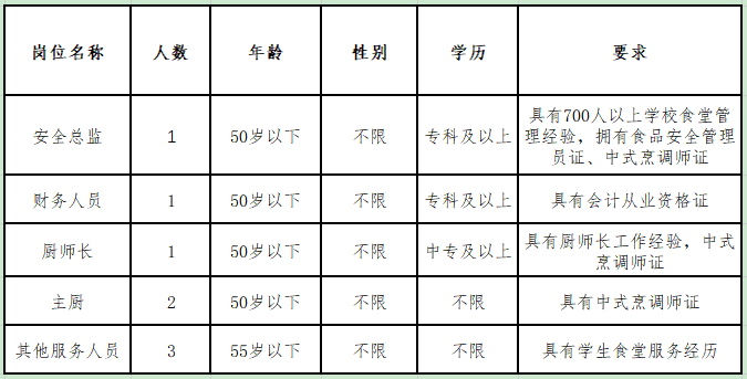 因?qū)W校食堂工作需要,現(xiàn)面向社會招聘工作人員,具體如下: