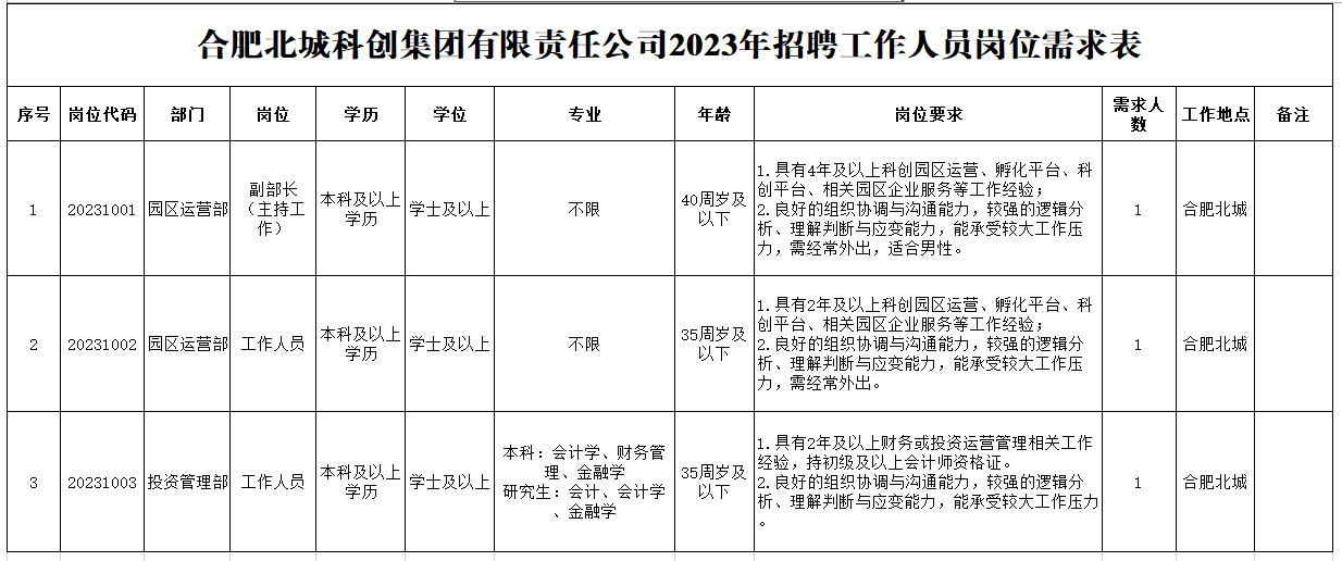 2023年合肥北城科創(chuàng)集團有限責任公司招聘工作人員公告