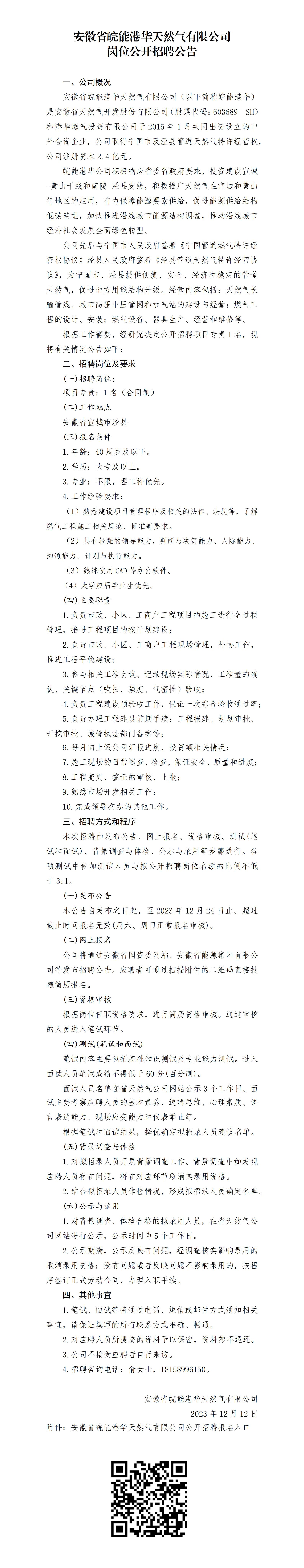 2023年安徽省皖能港華天然氣有限公司崗位公開(kāi)招聘公告