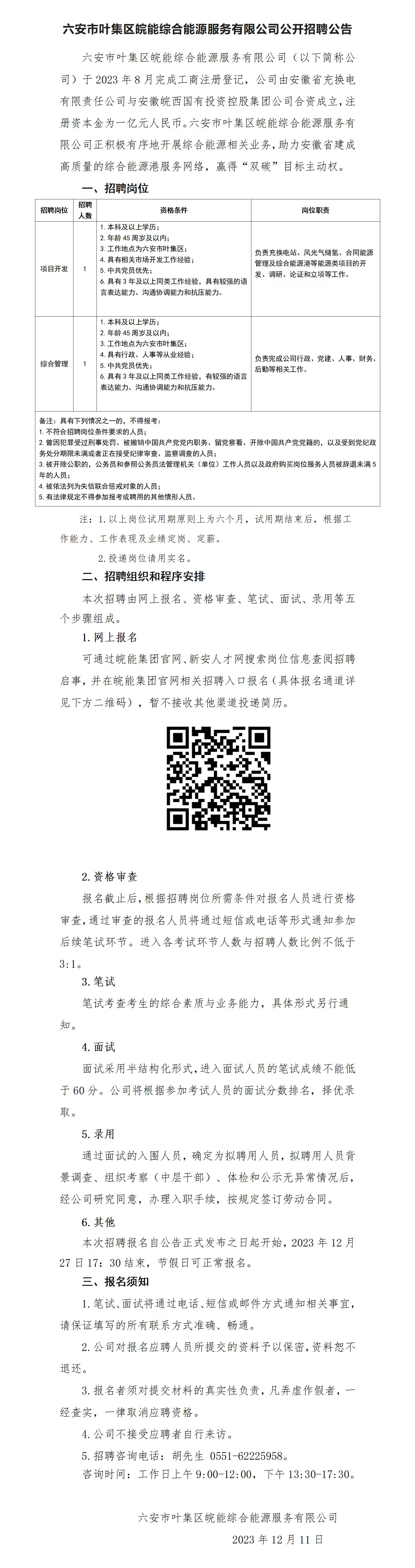 2023年六安市葉集區(qū)皖能綜合能源服務(wù)有限公司公開招聘公告