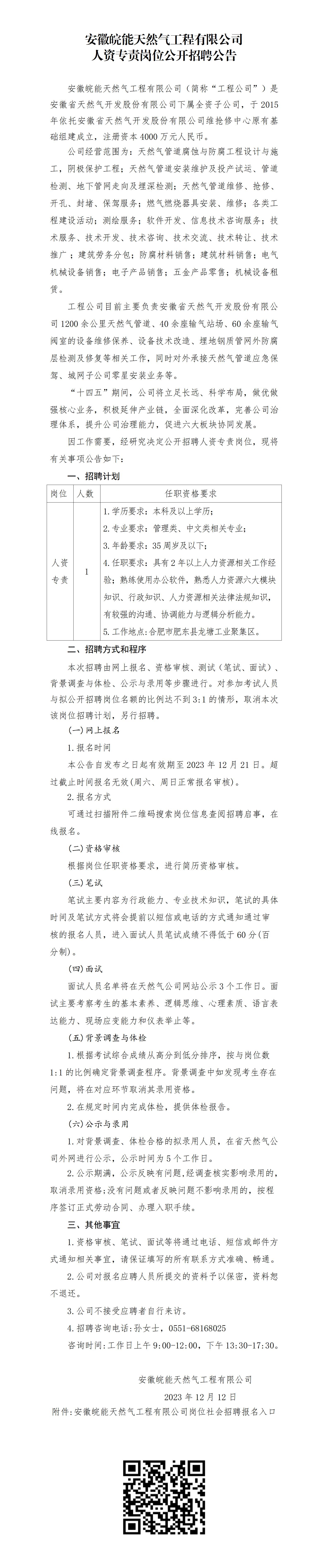 2023年安徽皖能天然氣工程有限公司人資專(zhuān)責(zé)崗位公開(kāi)招聘公告