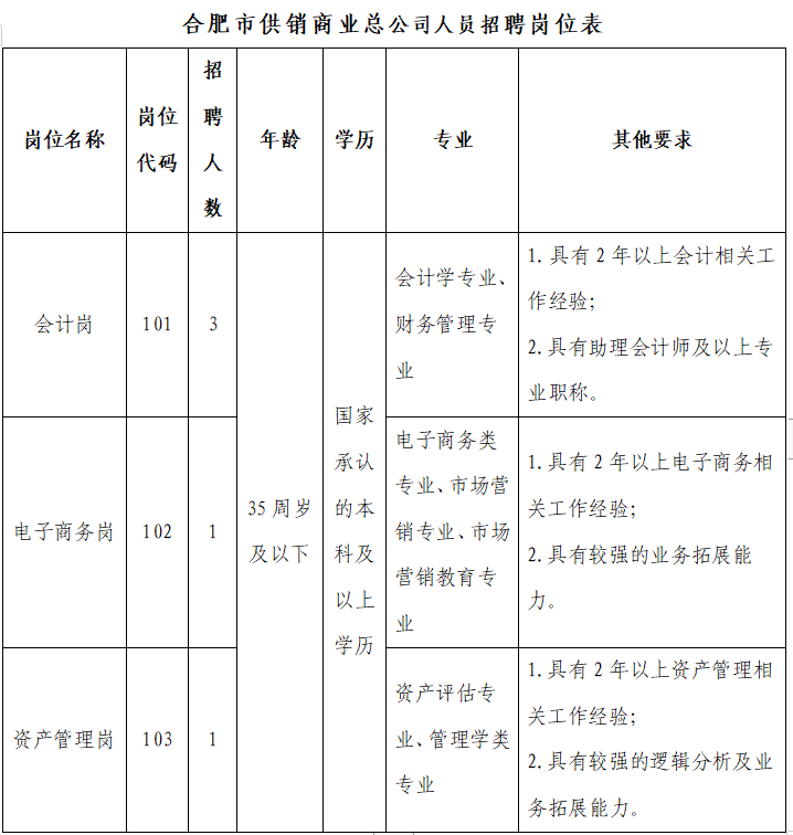 具體崗位及條件詳見附件《合肥市供銷商業(yè)總公司人員招聘崗位表》。