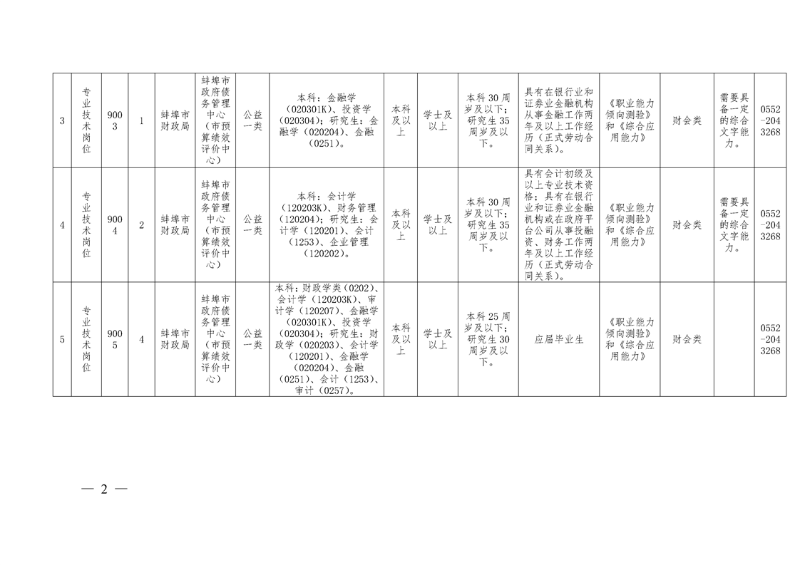 | 4 | 專業(yè)技術(shù)崗位 | 9004 | 2 | 蚌埠市財政局 | 蚌埠市政府債務(wù)管理中心(市預(yù)算績效評價中心) | 公益一類 | 本科:會計學(xué)(120203K)、財務(wù)管理(120204);研究生:會計學(xué)(120201)、會計(1253)、企業(yè)管理(120202)。 | 本科及以上 | 學(xué)士及以上 | 本科30周歲及以下;研究生35周歲及以下。 | 具有會計初級及以上專業(yè)技術(shù)資格;具有在銀行業(yè)和證券業(yè)金融機構(gòu)或在政府平臺公司從事投融資、財務(wù)工作兩年及以上工作經(jīng)歷(正式勞動合同關(guān)系)。 | 《職業(yè)能力傾向測驗》和《綜合應(yīng)用能力》 | 財會類 | 需要具備一定的綜合文字能力。 | 0552-2043268 |