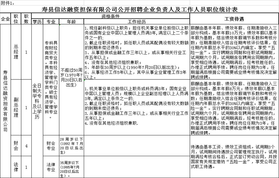 2020年淮南壽縣信達(dá)融資擔(dān)保有限公司公開招聘企業(yè)負(fù)責(zé)人及工作人員職位統(tǒng)計(jì)表