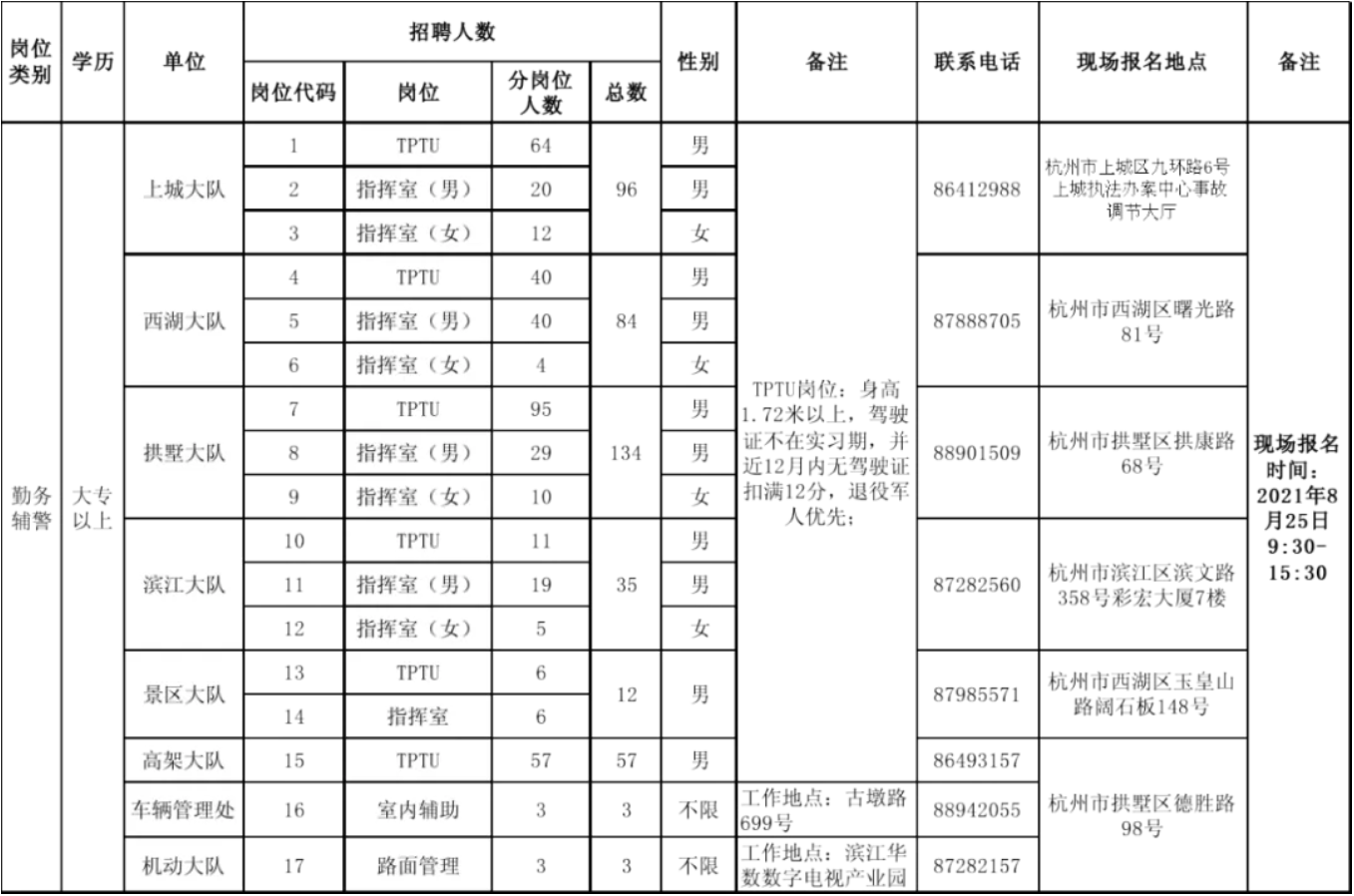 2021年杭州市公安局市局機關(guān)警務(wù)輔助人員(交通管理輔警)招聘公告