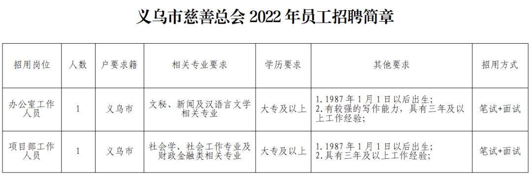 (1)應(yīng)聘人員須詳實(shí)填寫《義烏市慈善總會(huì)2022年員工招聘應(yīng)聘報(bào)名表》(附件2);