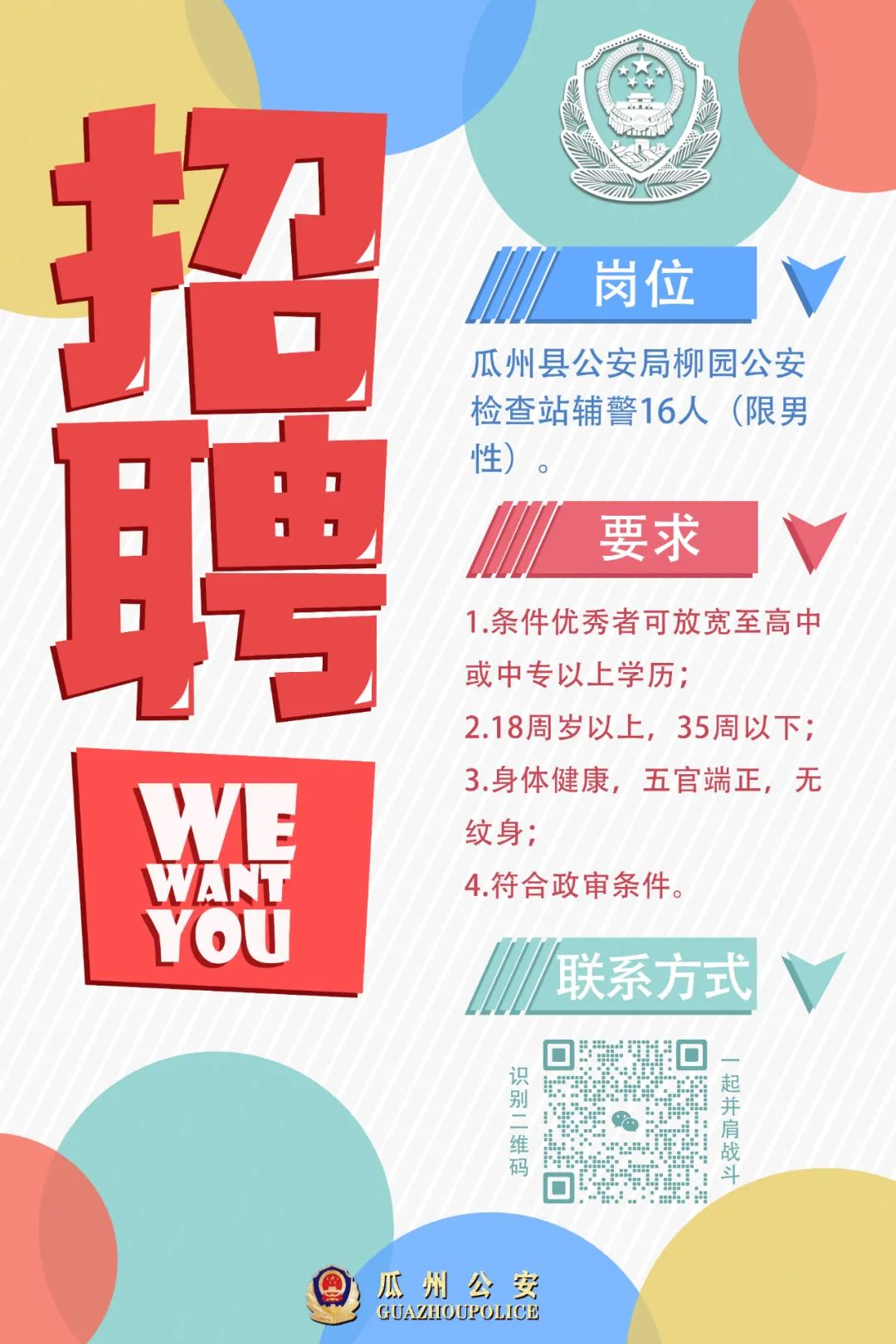 瓜州縣公安局柳園公安檢查站輔警16人(限男性)。