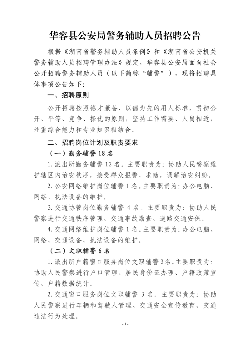 2023-09-20 17:57:55閱讀()華容縣人民政府根據《湖南省警務輔助人員條例》和《湖南省公安機關警務輔助人員招聘管理辦法》規(guī)定,華容縣公安局面向社會公開招聘警務輔助人員(以下簡稱“輔警”),現將招聘具體事項公告如下: