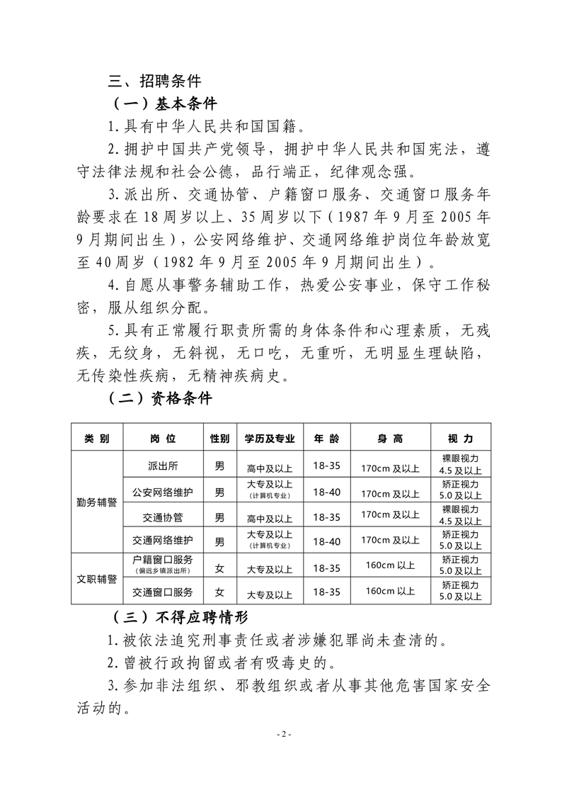 1.派出所戶籍窗口服務崗位文職輔警3名。主要職責為:協助人民警察進行戶口管理、居民身份證辦理、戶籍政策宣傳、戶籍數據統(tǒng)計。